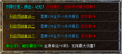 4、暴击升级1次,需50万金币+2赤月精石,成功率1%,最高+3