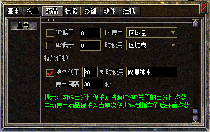 【内挂喝药】:为节约要钱,你也可以设置F12内挂保护的自动喝药,只能设置强效金疮药和强效魔法药水!