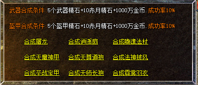 【剑甲合成】:5个精石+10赤月精石+1000万金币即可合成,合成成功率为10%