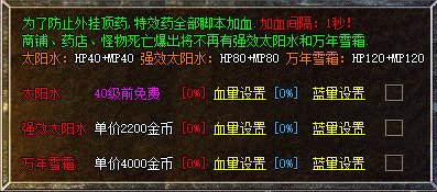 【内挂喝药】:为节约要钱,你也可以设置F12内挂保护的自动喝药,只能设置强效金疮药和强效魔法药水!