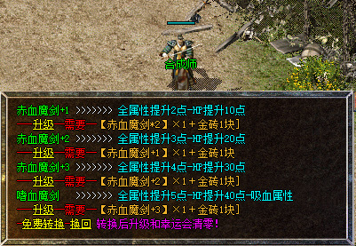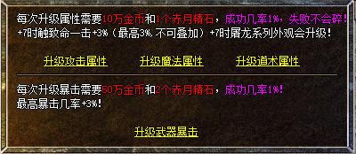 3、属性升级1次,需10万金币+1赤月精石,成功率1%,最高+7