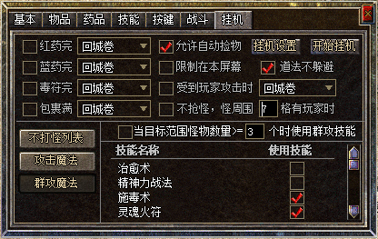 5、挂机面板下方设置挂机技能!请注意配合设置脚本自动喝药!还可设置挂机随机保护、回城保护!